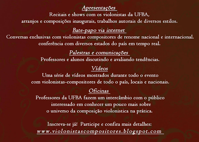 A Mostra de Violonistas Compositores da Escola de Música da UFBA é um espaço não competitivo, um momento para a divulgação e reflexão da música produzida na atualidade por alunos e professores da UFBA, em todas as suas instâncias, que tem uma relação direta ou indireta com a composição para violão!!!
